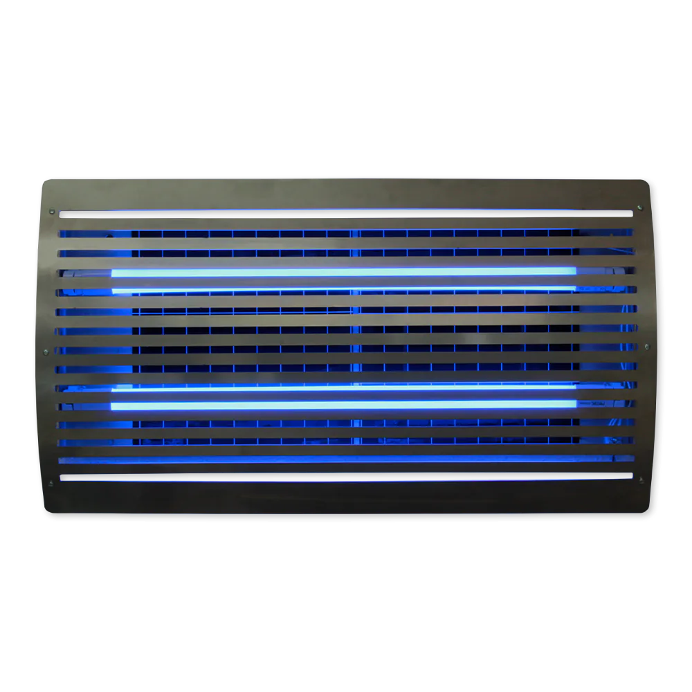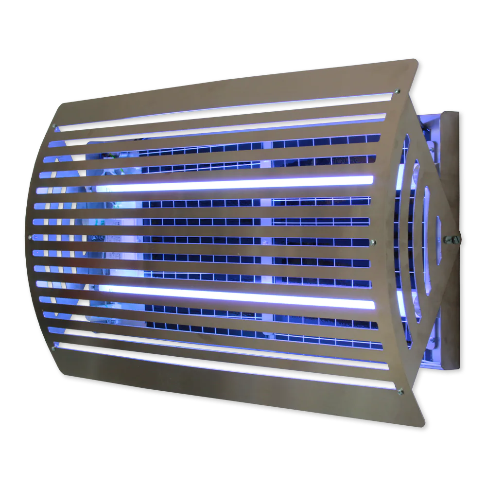 Totalmente fabricado en acero inoxidable AISI304,tiene una gran presencia, robusto, resistente, profesional y con una excelente estética. El frontal pivotante permite modificar el aspecto del aparato para adaptarlo a la configuración del local mientras que el recambio adhesivo con fondo negro evita que los insectos atrapados puedan ser vistos por el usuario. La sustitución del recambio se realiza de manera sencilla en apenas unos segundos y sin herramientas.